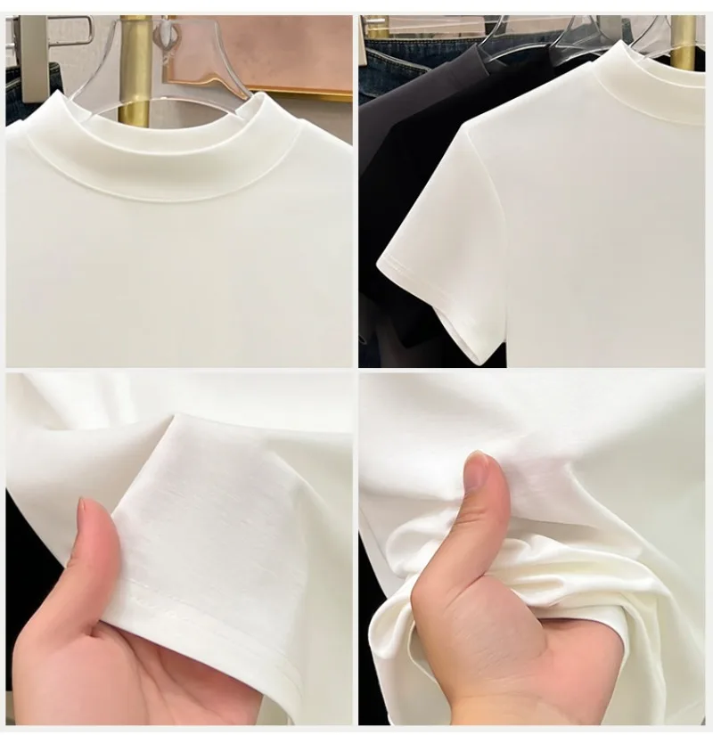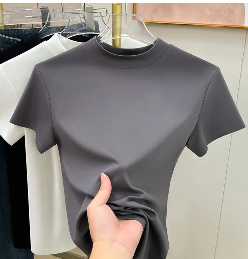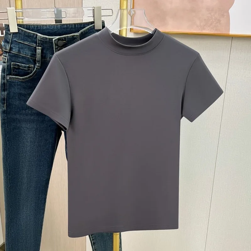 Fashion Half High Collar Short Sleeve Tops Summer Solid Color Slim Fit T-shirts for Women Tees Office Lady Clothes T274